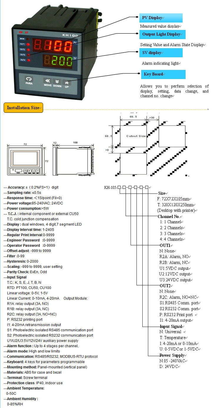 KH105D is low cost multi channel process indicator (160X80X105mm, up to 48 channels), used the advanced technology, to be designed high quality and performance, high accuracy, single or universal input use, to be aimed to monitor, display, analysis the processes in various industry application.