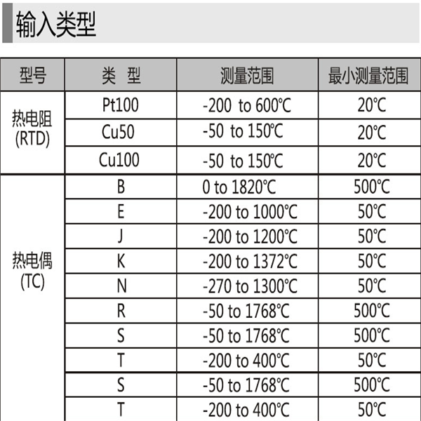 ●輸入:熱電阻(RTD)、熱電偶(TC)、電阻(Ω)、電壓(mV)