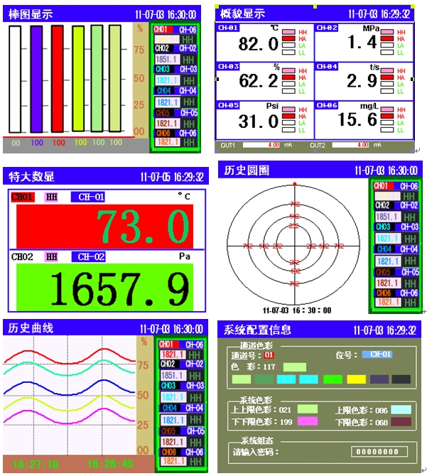 KH300AG智能小型彩色無紙記錄儀(96×96mm最多6通道輸入)具有全隔離萬能輸入功能,集熱電偶信號、熱電阻信號、標準電壓、標準電流、脈沖信號于一體。可提供通訊、打印、報警、饋電等功能。儀表具有強大的顯示功能,高精度棒圖顯示、實時曲線顯示、歷史曲線追憶、中圓圖顯示、歷史圓圖追憶、報警狀態顯示,同時可直接查詢年、月、日、時、分、秒的數據,快捷方便,頁面刷新速度小于1秒。使用RS232/485通訊,標準MODBUS-RTU協議,可與組態王、MCGS等專業軟件進行組態。數據可直接通過任意U盤導出,U盤即插即讀,無需任何操作;分析軟件可導出EXCEL數據格式或曲線格式,直接打印即可,兩者同時使用或兩者選其一。